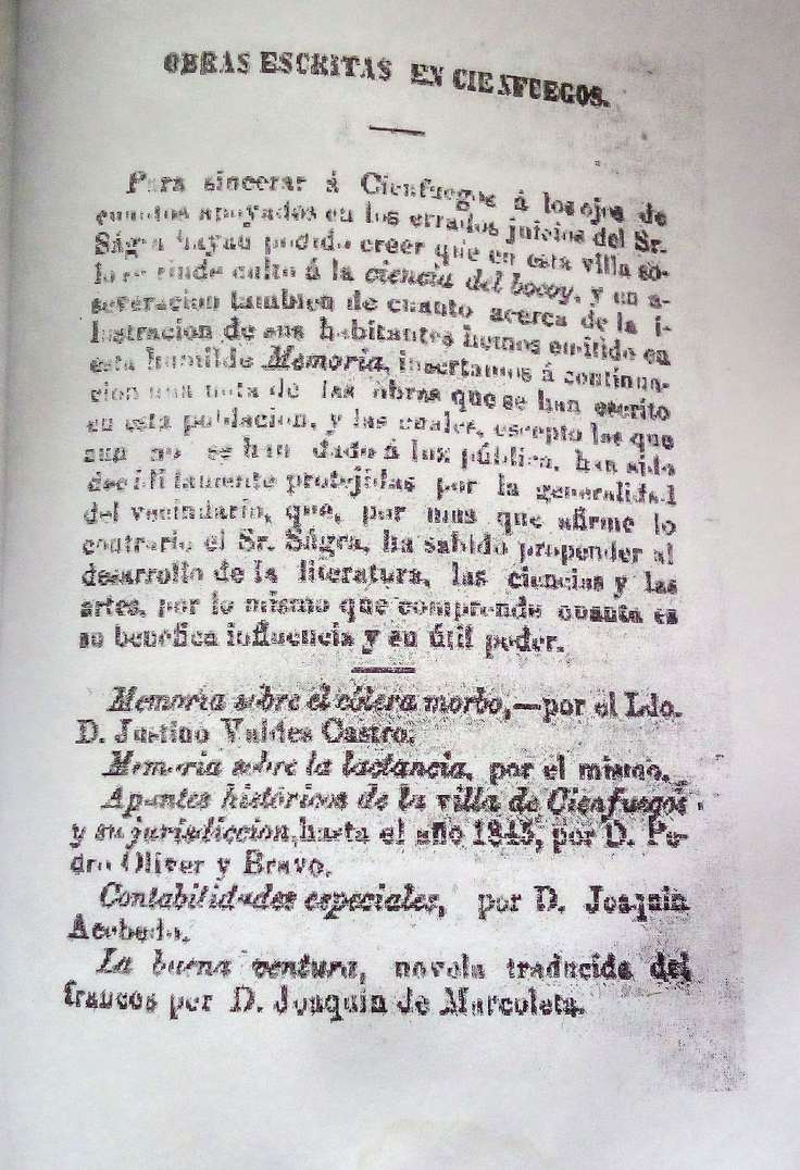 Los fantasmas que deambulan por las rectilíneas y decimonónicas calles cienfuegueras, son tan respetables como los que (por poner algunas muestras) vagan por los puentes de Matanzas o como aquellas que convirtieron a la ciudad de La Habana en una zona de hechizo. Sus signos, de una forma u otra, se entremezclan: la olvidada Adelaida Saínz establece un imaginario contrapunto con Milanés, el desdichado Hurtado del Valle se cartea con Zenea y el visionario espíritu de Mercedes Matamoros reconoce antes que muchos otros que en José Martí lo cubano había alcanzado su expresión más alta”, refiere en los inicios de la obra, donde se desgrana en un comienzo la paradoja y las tensiones entre el pensamiento letrado en ciernes, con el de, por ejemplo, el fundador de la colonia Fernandina de Jagua, don Luis de Clouet, en una localidad que surgía por aquellos años como heredera del espíritu ilustrado de la época.