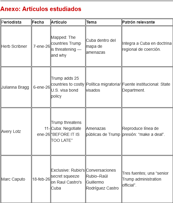 El análisis se basa en diez artículos de Axios sobre Cuba, correspondientes al período enero-abril de 2026. Se incluyeron todos los textos verificables dedicados exclusivamente a Cuba y se desecharon aquellos boletines (“Top stories”) donde nuestro país aparece de forma agregada o con menciones menores; es decir, se excluyeron aquellos artículos donde la isla no era el eje central de la pieza periodística.