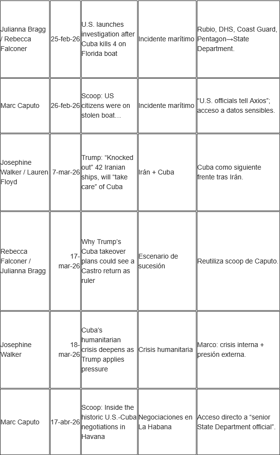 Durante los primeros meses de 2026, el medio digital estadounidense Axios publicó una secuencia de artículos sobre Cuba que, leídos de forma aislada, pueden parecer notas de actualidad sobre diplomacia, seguridad, migración o crisis humanitaria.