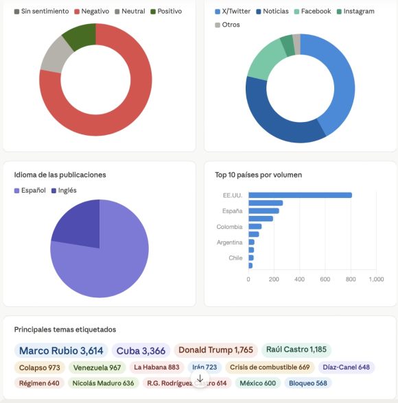 Adicionalmente, se han recopilado y analizado las menciones a los artículos de este medio en la conversación digital asociada a Cuba en Internet, en el período comprendido entre el 1 de enero y el 20 de abril de 2026. Este análisis complementario, obtenido con herramientas de escucha digital, análisis de redes y procesamiento automatizado de datos, nos ha permitido evaluar el impacto de dichas publicaciones —y de las posibles filtraciones que contienen— en la configuración de la opinión pública, para verificar picos de difusión, actores amplificadores y patrones de recepción en el ecosistema digital.