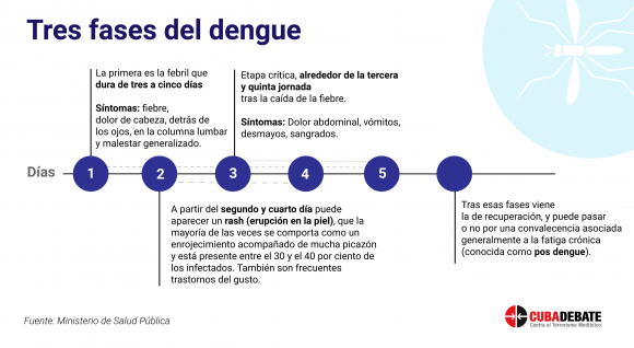 El doctor Osvaldo Castro Peraza, Máster en infectología y enfermedades tropicales del IPK, detalló en el citado artículo que dolor abdominal intenso y mantenido, vómitos frecuentes, irritabilidad y somnolencia fuera de lo habitual —especialmente en niños pequeños—, desmayos, sangrados de mucosa y aumento del hematocrito (volumen de sangre ocupado por glóbulos rojos) son anuncios del dengue grave.