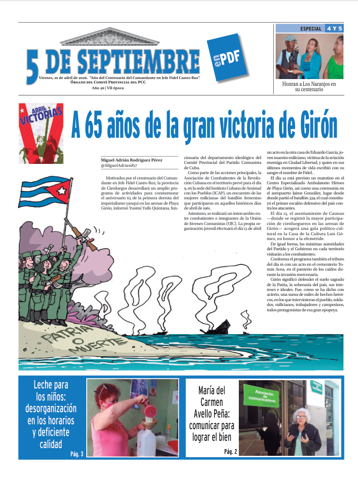 Noticias Principales Sociedad Conozca nuestra edición semanal en PDF del 10 de abril 9 abril, 2026 5 de Septiembre 0 comentarios Cienfuegos, Cuba, pdf, Periódico 5 de Septiembre Compartir en Tiempo de lectura aprox: 5 segundosEste número incorpora materiales de corte crítico, reseñas, comentarios e informaciones sobre la actualidad de Cienfuegos, en textos escritos por nuestros periodistas y colaboradores. Visitas: 5