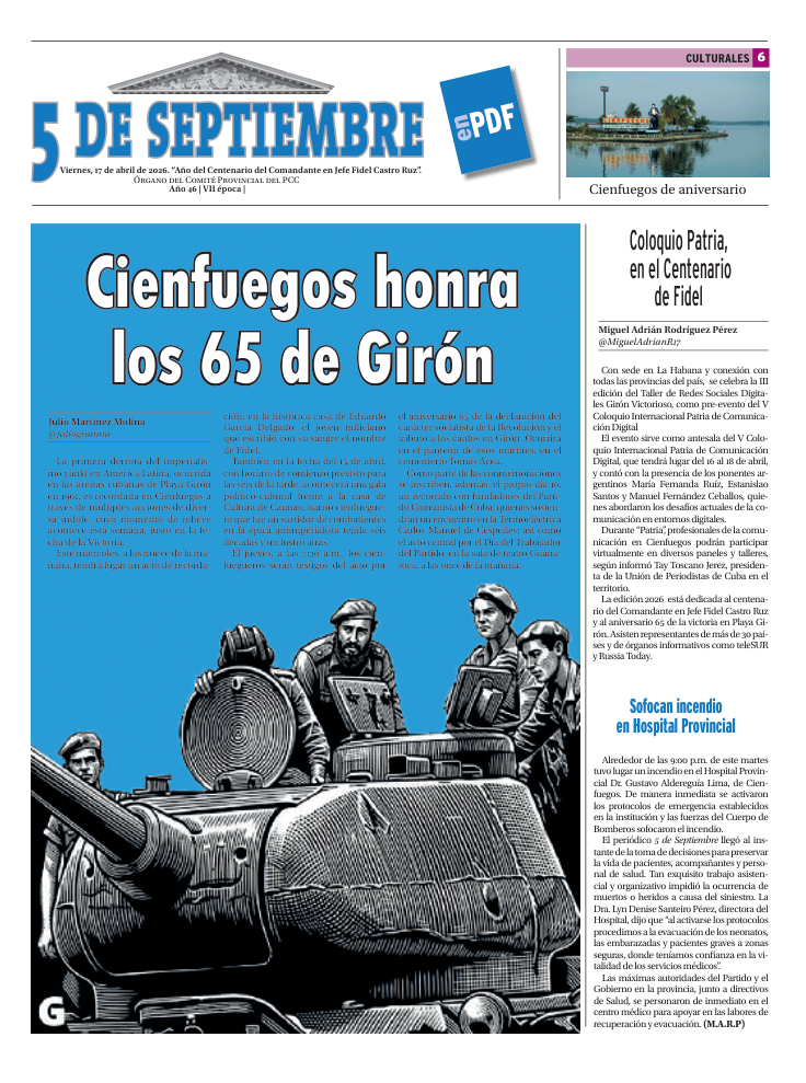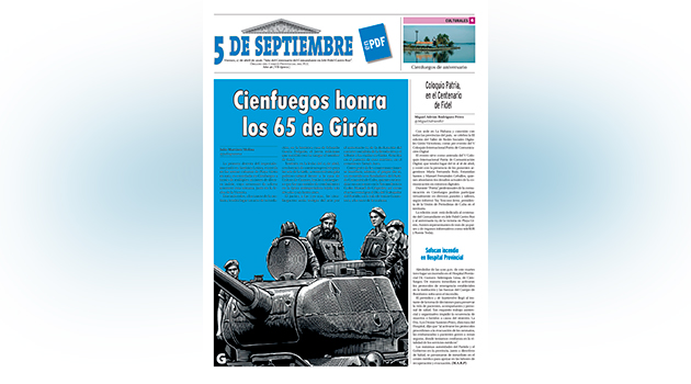 En esta edición podrá encontrar trabajos sobre el aniversario 65 de la victoria en Playa Girón, el incendio sofocado en el Hospital Gustavo Aldereguía Lima, los actos vandálicos cometidos contra Etecsa en la provincia y el aniversario 207 de la fundación de Cienfuegos, entre otros materiales.