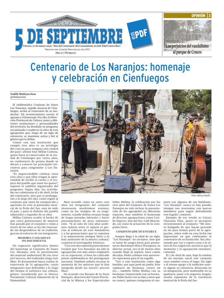 La edición semanal del periódico 5 de Septiembre está disponible para su descarga en formato PDF. En sus ocho páginas encontrará una selección de contenidos sobre la actualidad de la provincia de Cienfuegos.