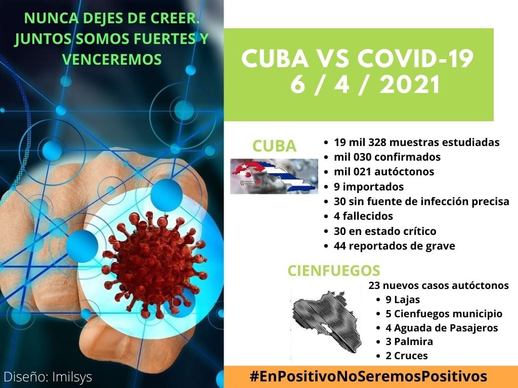 Durante 8 días consecutivos se diagnostican en Cuba más de mil pacientes diarios, cifra que traduce la complicada situación epidemiológica que muestra el país. Al cierre de la jornada del 5 de abril se reportan mil 30 positivos al SARS-CoV-2, y se lamentan 4 fallecidos. Cienfuegos confirma 23 casos, 12 más que ayer, todos autóctonos, y uno sin fuente de infección determinada, el resto se contagia a partir de casos positivos.
