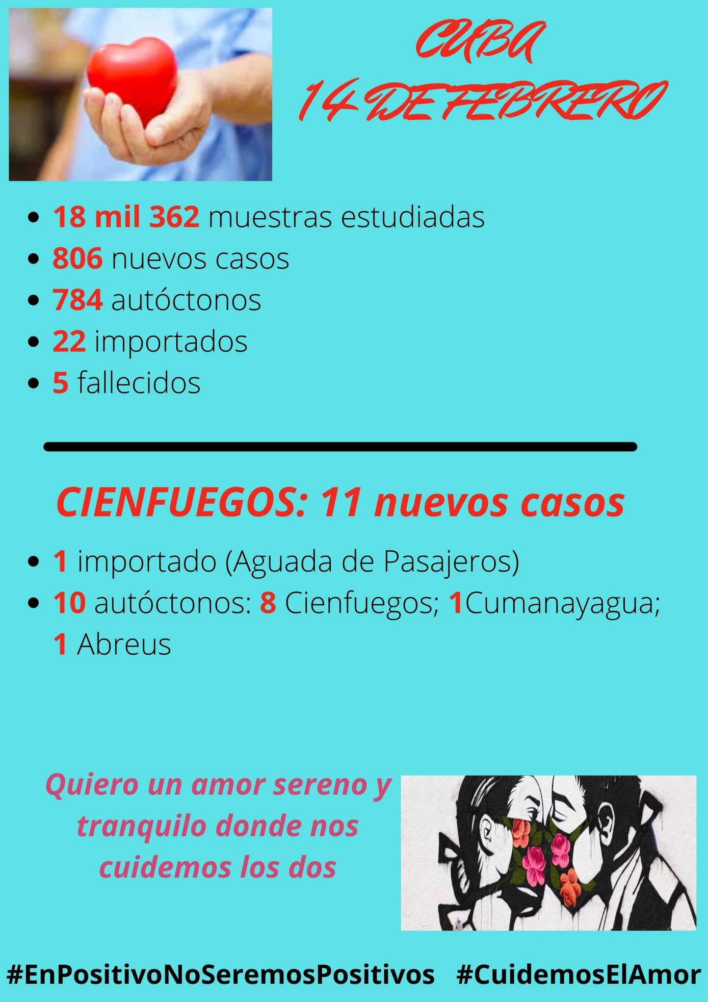El domingo 14 de febrero Cuba amanece con 18 mil 329 personas ingresadas, quienes se relacionan con la COVID-19, de ellos 4 mil 800 son activos. En la jornada con cierre 13 de febrero, se analizaron 18 mil 362 muestras de PCR en tiempo real, y como resultado, 806 fueron positivas. Se lamentan 5 fallecidos. En Cienfuegos se reportan 11 confirmados, uno importado, el resto autóctonos.