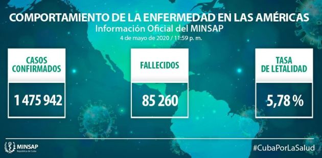 Hasta el 4 de mayo se reportan 184 países con casos de COVID-19 con 3 millones 467 mil 321 casos confirmados (+ 78 mil 656) y 246 mil 979 fallecidos (+ 3 mil 667) con una letalidad de 7,12% (-0,06).