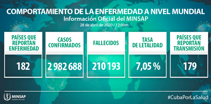 Hasta el 28 de abril se reportan 183 países con casos de COVID-19 con 2 millones 982 mil 688 casos confirmados (+66 mil 350) y 210 mil 193fallecidos (+ 4 mil 270) para una letalidad de 7,05% (-0,01).