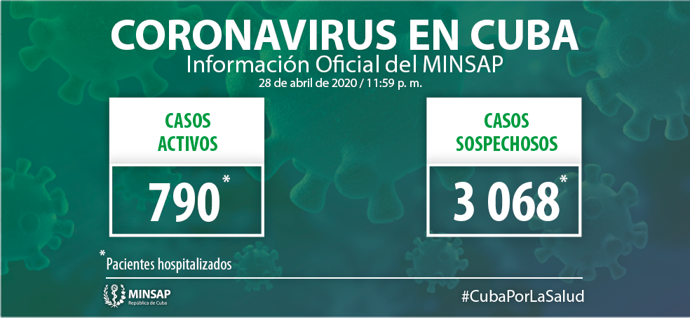 Más adelante continuó con las estadísticas diarias. Al cierre del día de ayer, 28 de abril, se encuentran ingresados en hospitales para vigilancia clínico epidemiológica 3 mil 68 pacientes. Otras 6 mil 839 personas se vigilan en sus hogares, desde la Atención Primaria de Salud.