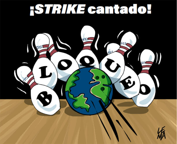 Es cierto. Existe. No es un invento. Sigue en pie. Ahora más recrudecido. Resoluciones aprobadas en la ONU no lo quitan. La solidaridad ayuda a atenuarlo. Su objetivo supremo es hacer morir por hambre y enfermedades a un pueblo entero. Crear un descontento en la población para derrocar a la Revolución es el fin