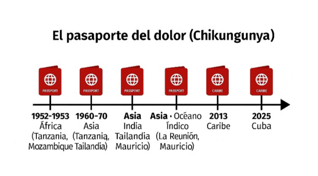 Según cuentan, el pasaporte del dolor comenzó a sellarse en 1952, en la meseta Makonde, entre Tanzania y Mozambique, donde el virus emergió en un entorno selvático favorecido por la abundancia del Aedes aegypti. Desde allí, el viajero invisible se desplazó hacia el sudeste asiático en las décadas de 1960 y 1970, con brotes en India y Tailandia impulsados por la urbanización acelerada, la falta de control vectorial y la movilidad internacional.