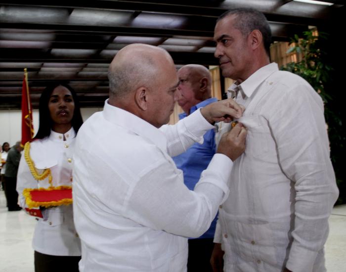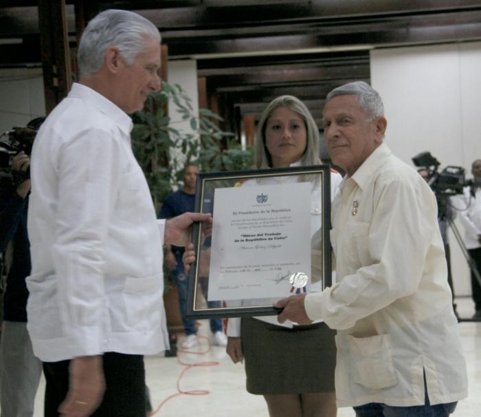 Bajo la premisa de que el trabajo es esencia y motor de la sociedad, el Primer Secretario del Comité Central del Partido y Presidente de la República, Miguel Díaz-Canel Bermúdez, impuso esta alta condecoración a: Martha López Guzmán, de la UBPC José Martí; Luis Oscar Gálvez Taupier, del Icidca; Graciela María Rodríguez Pérez, de la Fundación Alejo Carpentier; Antonio Gómez Delgado, del Sistema Informativo de la TVC y Estudios Revolución; Edilia Fuertes Díaz, de la Facultad del Partido Abel Santamaría Cuadrado; Miguel Ángel Franco Noa, de la Dirección General de Educación Municipal, en Santiago de Cuba; Magdelaine Sosa Menencia, del Instituto Politécnico Manifiesto de Montecristi; y Luis Manuel Videaux Aguilar, de la Empresa de Níquel Ernesto Che Guevara.