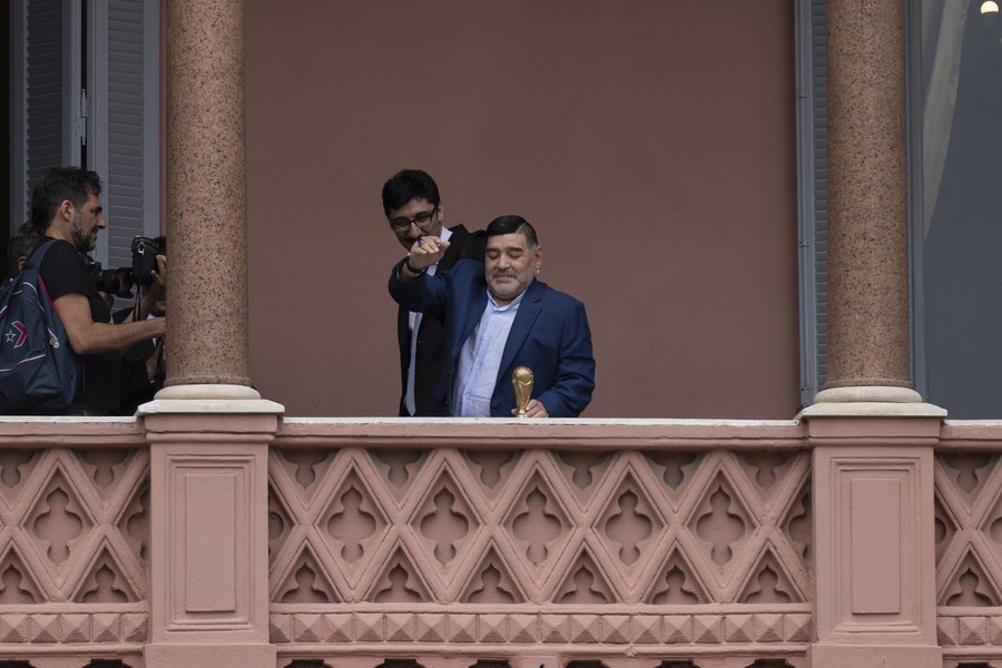 Diego Armando Maradona (d), sosteniendo una réplica en miniatura de la Copa del Mundo desde uno de los balcones de la Casa Rosada en la ciudad de Buenos Aires, capital de Argentina, el 26 de diciembre de 2019. (Xinhua/Martín Zabala). Imagen de archivo