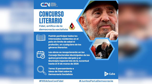 Para homenajear al líder indiscutible de la Revolución cubana, a propósito del centenario de su natalicio a conmemorarse el 13 de agosto de 2026, el Consejo Electoral Nacional (CEN) convoca al concurso literario “Fidel, artífice de la Democracia Socialista”.