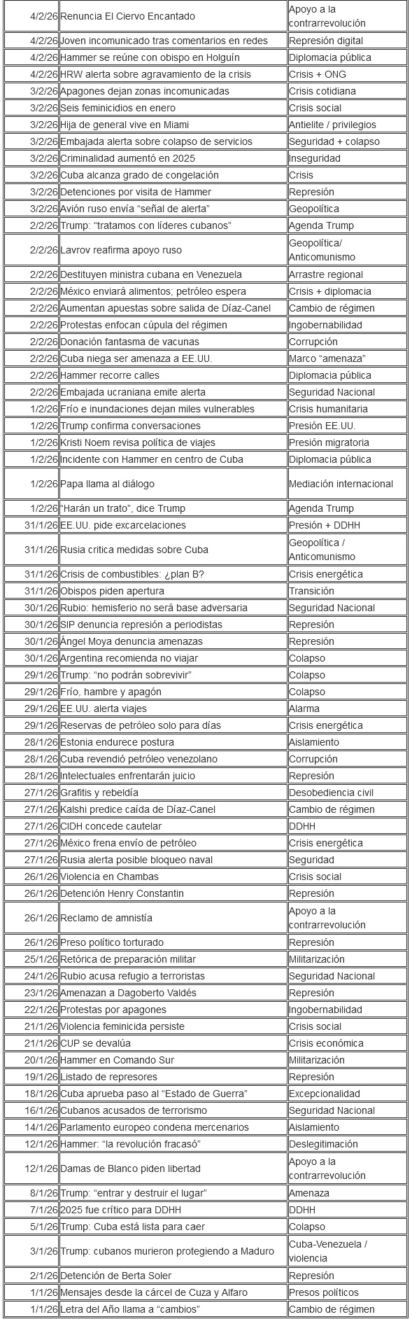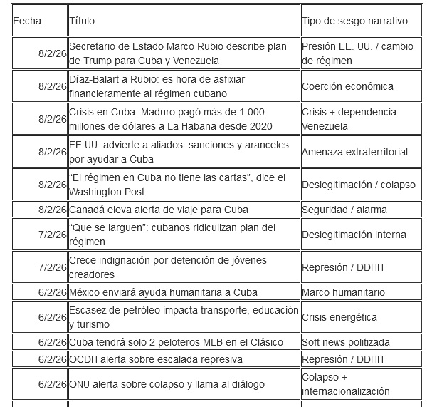 Hemos descargado los artículos publicados bajo la sección Cuba en Martí Noticias, del 1 de enero de 2026 al 8 de febrero de 2026. Se han identificado los sesgos/temas dominantes, según la teoría de la agenda-setting:
