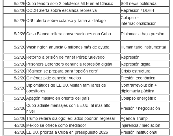 Al mismo tiempo, esta agenda implica una exclusión activa, aunque silenciosa. Apenas tienen espacio las políticas públicas cotidianas, los debates internos complejos, los procesos sociales diversos, la cooperación internacional no alineada con Washington o cualquier expresión de normalidad institucional. Estos asuntos son deliberadamente excluidos. Y lo que no entra en la agenda mediática rara vez lo hace en la agenda mental del público y en la lógica “informativa” del clúster de sitios y operadores digitales oficiosos de Martí Noticias que operan desde la Florida e intoxican el ecosistema digital cubano.