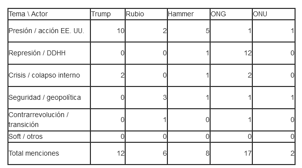 La teoría de la agenda-setting no se limita a contar temas; también analiza quiénes aparecen como voces autorizadas y qué atributos se asocian a cada asunto. En este periodo, los titulares más destacados incorporan con frecuencia a actores de alto estatus político: el presidente de Estados Unidos, el Secretario de Estado, congresistas influyentes, la Embajada de Estados Unidos en La Habana (en particular el Encargado de Negocios, Mike Hammer) y organizaciones no gubernamentales y Naciones Unidas.