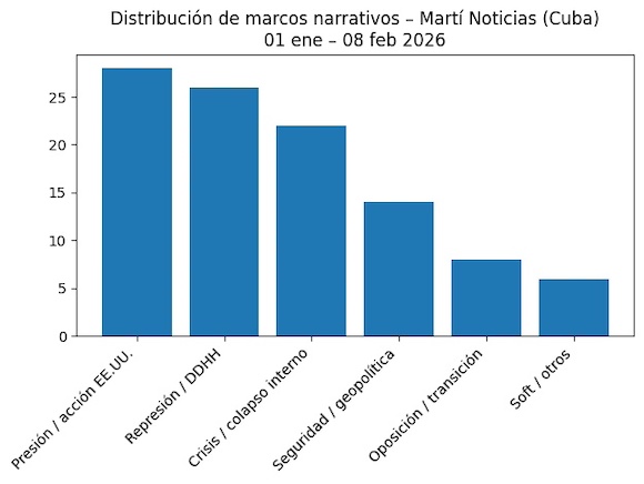 Un análisis de la cobertura de Martí Noticias entre el 1 de enero y el 8 de febrero de 2026 permite identificar un patrón claro y sostenido. El medio gubernamental estadounidense construye a Cuba como un país en colapso permanente, cuyo desenlace estaría ligado, de forma casi exclusiva, a la presión de Washington.