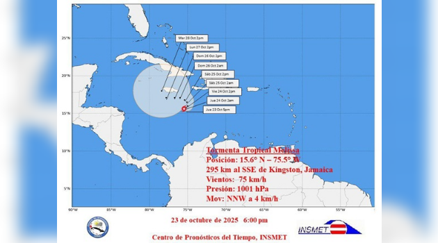A las seis de la mañana la región central del huracán Melissa fue estimada en los 16.3 grados de latitud Norte y los 76.4 grados de longitud Oeste, posición que lo sitúa a unos 180 kilómetros al sur-sudeste de Kingston, Jamaica y a 415 kilómetros al sur de la ciudad de Santiago de Cuba. Melissa se mueve con un rumbo próximo al oeste y posee una velocidad de traslación de siete kilómetros por hora.