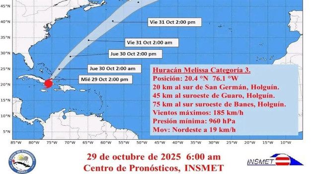 El Insmet precisó que la interacción del sistema con tierra continúa debilitándolo. Sus vientos máximos sostenidos han disminuido a 185 kilómetros por hora, con rachas superiores, y su presión central es de 960 hectopascales. Aun así, Melissa se mantiene como un huracán de gran intensidad, categoría tres en la escala Saffir-Simpson.