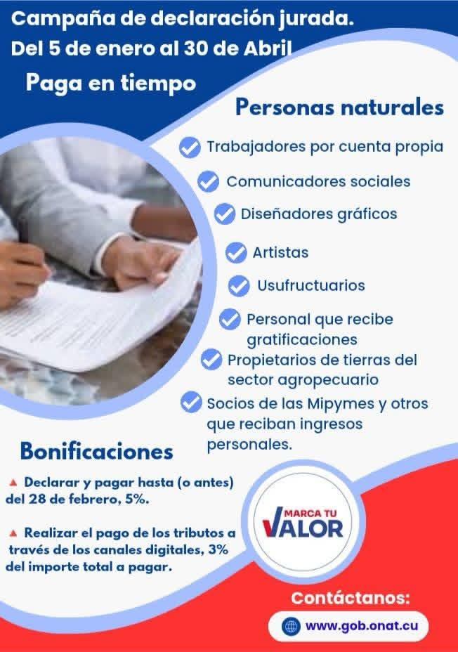 Con el inicio del año 2026 la Oficina Nacional de Administración Tributaria (ONAT) informa a los contribuyentes, personas naturales y jurídicas, la Campaña de Declaración y Pagos de Tributos, así como los plazos para cada uno de los impuestos a pagar.