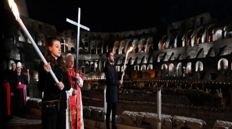 El Obispo de Roma, flanqueado por dos jóvenes portadores de antorchas, sostuvo la cruz durante las 14 estaciones del Vía Crucis, cinco dentro y nueve fuera de la antigua arena iluminada por teas.