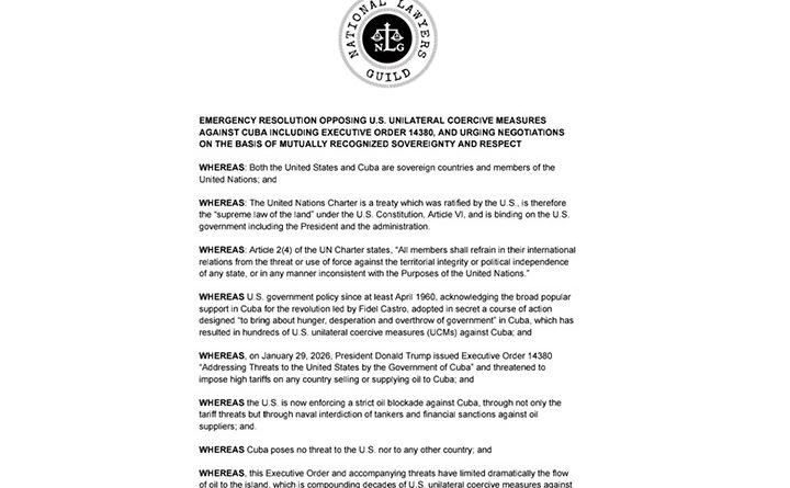 El Gremio Nacional de Abogados de Estados Unidos aprobó recientemente una resolución de emergencia que rechaza las medidas coercitivas unilaterales contra Cuba, incluida la Orden Ejecutiva 14380 emitida por el presidente Donald Trump el 29 de enero de 2026, informó la Cancillería de Cuba desde su perfil oficial en Facebook.