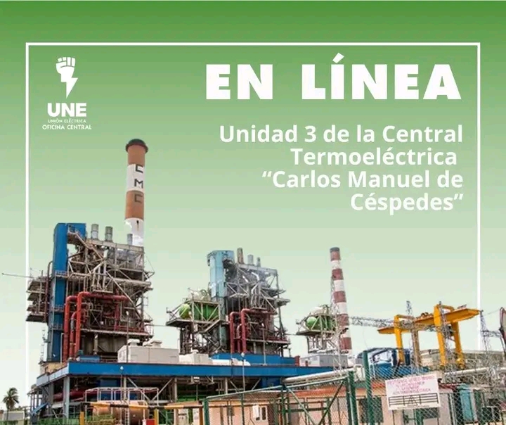 La Unión Eléctria informa que ya está en línea la Unidad 3 de la CTE Carlos Manuel de Céspedes. Ambas unidades cienfuegueras están sincronizadas al SEN.