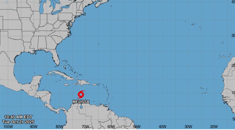 Según el aviso del NHC, a las 11 a.m. Melissa estaba situada en los 14.3 grados de latitud Norte y los 71.7 de longitud Oeste, aproximadamente a unos 480 km de Puerto Príncipe, Haití.