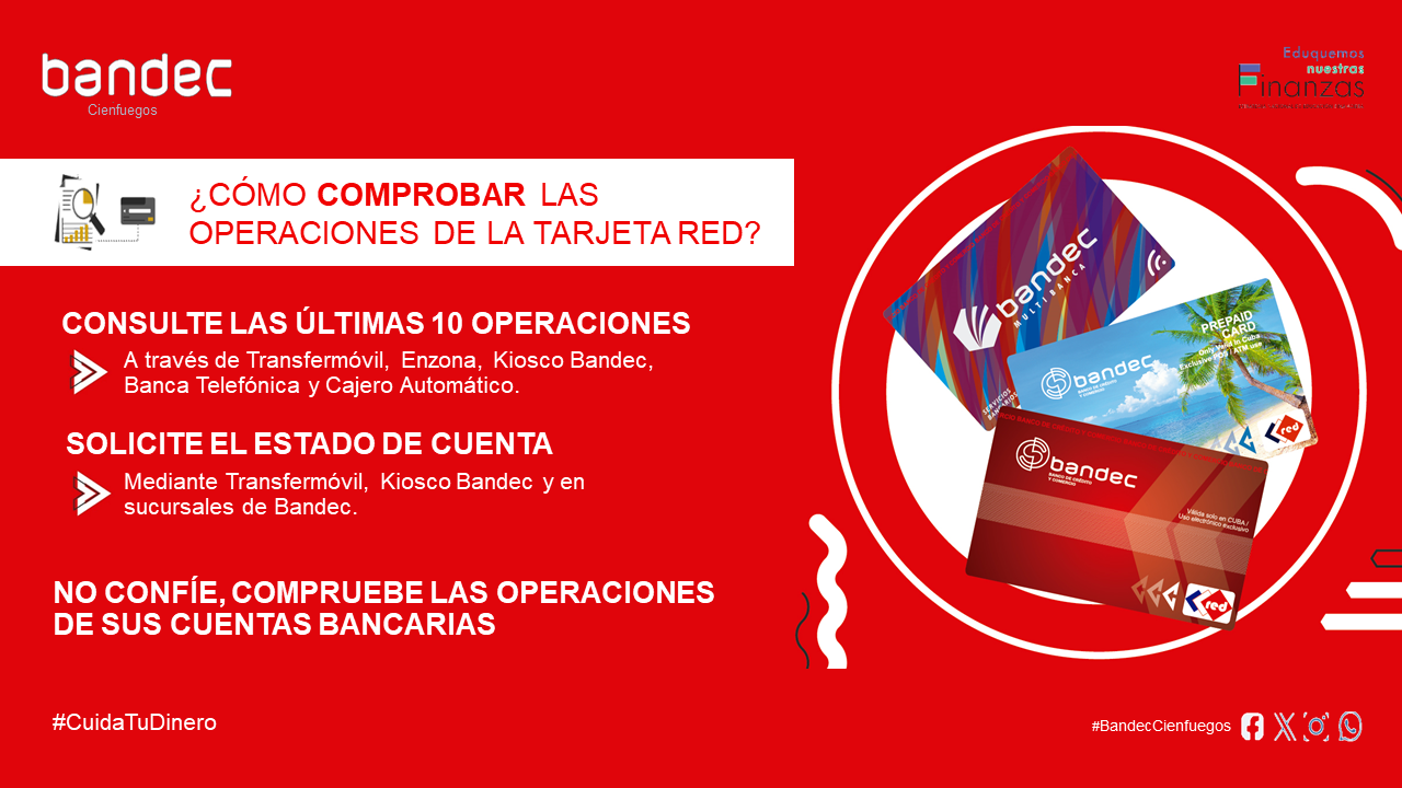 Consultar el saldo y últimas operaciones de la tarjeta Red es de las operaciones comunes en los canales de pagos electrónicos para personas naturales; son trámites disponibles con el uso del cajero automático, luego en la banca telefónica y con el transcurso del tiempo mediante Transfermóvil, Enzona y la banca remota tal como el Kiosco Bandec, así como para las cuentas empresariales el Virtual Bandec.