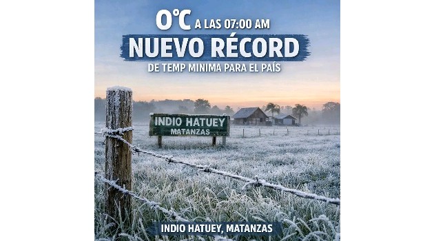 La estación de Indio Hatuey, en la provincia de Matanzas, ha registrado una temperatura de 0 ⁰C a las 07:00 horas de este martes 3 de febrero de 2026, un nuevo récord de mínima desde que se tienen registros en Cuba.