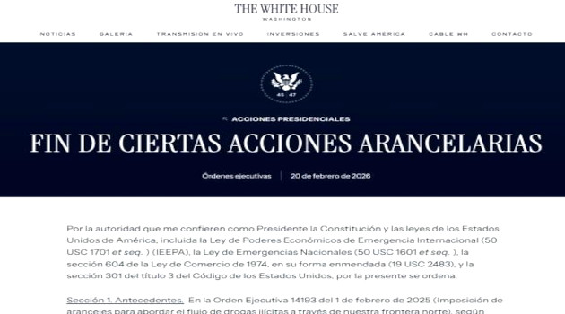 El presidente Donald J. Trump firmó el 20 de febrero de 2026 una nueva orden ejecutiva, dada a conocer hoy en el sitio de la Casa Blanca, que pone fin a los aranceles ad valorem adicionales impuestos en virtud de la Ley de Poderes Económicos de Emergencia Internacional (IEEPA).