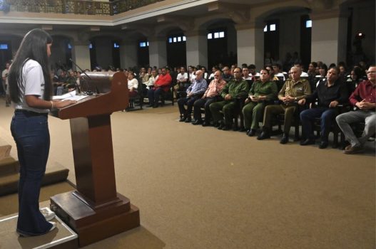 Rememoró la valiente expresión de confianza de Fidel en las nuevas generaciones, cuando «nos dijo que nuestros enemigos históricos jamás podrían destruir la Revolución, pero nosotros sí»; y que lo hizo «desde el convencimiento y la fe en la victoria, contando con el principal ejército que siempre ha tenido la defensa de la obra revolucionaria: el pueblo, y dentro de este, la juventud cubana».